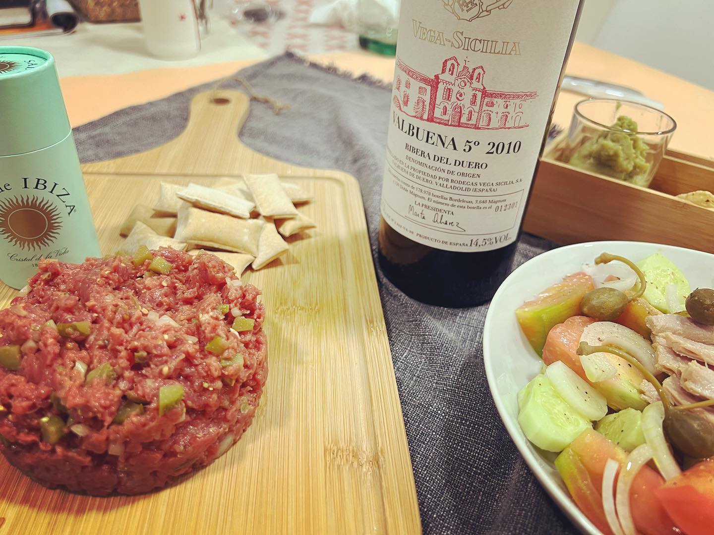 Avui si!! Un bon steak tàrtar (Can Serra), una bona amanida de tomàquet de la pera, ceba de Figueres i cogombrets (del nostre hort) i alcaparrons i l’esperat Vega Sicilia Valbuena 5’ 2010. Passa el temps i un dia per altre … passa volant! D’ Avui no podia passar! La vida son 4 dies i tinc el millor company de viatge.